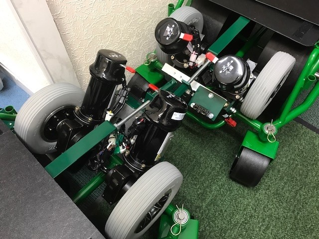 The centre of gravity position can be moved forward or backward by adjusting the main wheel location forward or backward. This ensures all the weight is always on the large wheels and not on the small ones whatever the persons weight or size. small wheels lift off the green.