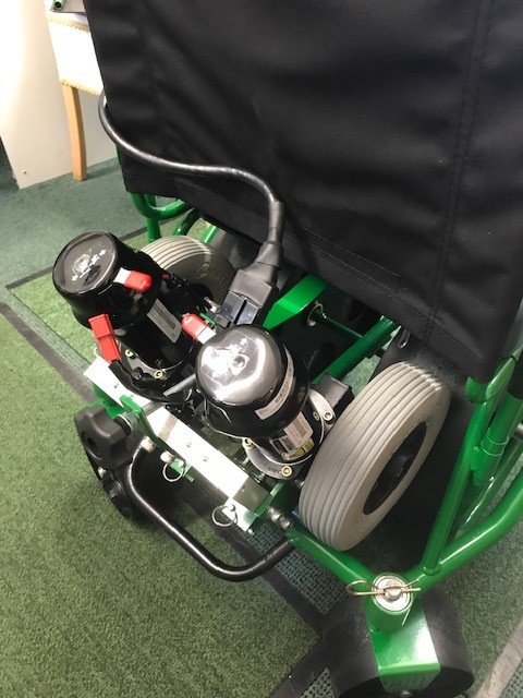 This Bradshaw bowls buggy was converted to a powered unit by glenn alan and jack at Guiseley mobility.If you have this type of buggy we can convert yours too The power unit can be removed easily to transport.